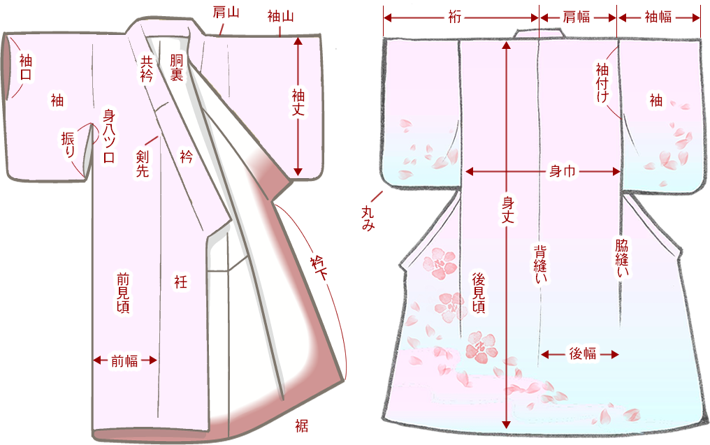 着物の各部分の名前は、聞きなれない言葉が多くありますが、 前見頃(まえみごろ)、後ろ見頃(うしろみごろ)、衽(おくみ)、袖(そで)、襟(えり)、など基本的な部位は覚えておきましょう。身丈、身巾、裄(ゆき)等も覚えておくと便利です。