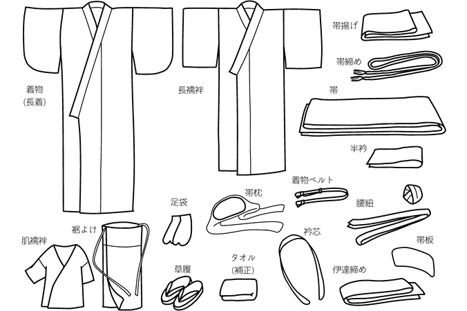着物をキレイに着るには、いろいろな小物が必要です。着付けを専門の方にお願いする場合は、予め準備されている場合が多いです。ご自分で着付けにチャレンジする場合は、イラストの物を揃えましょう。